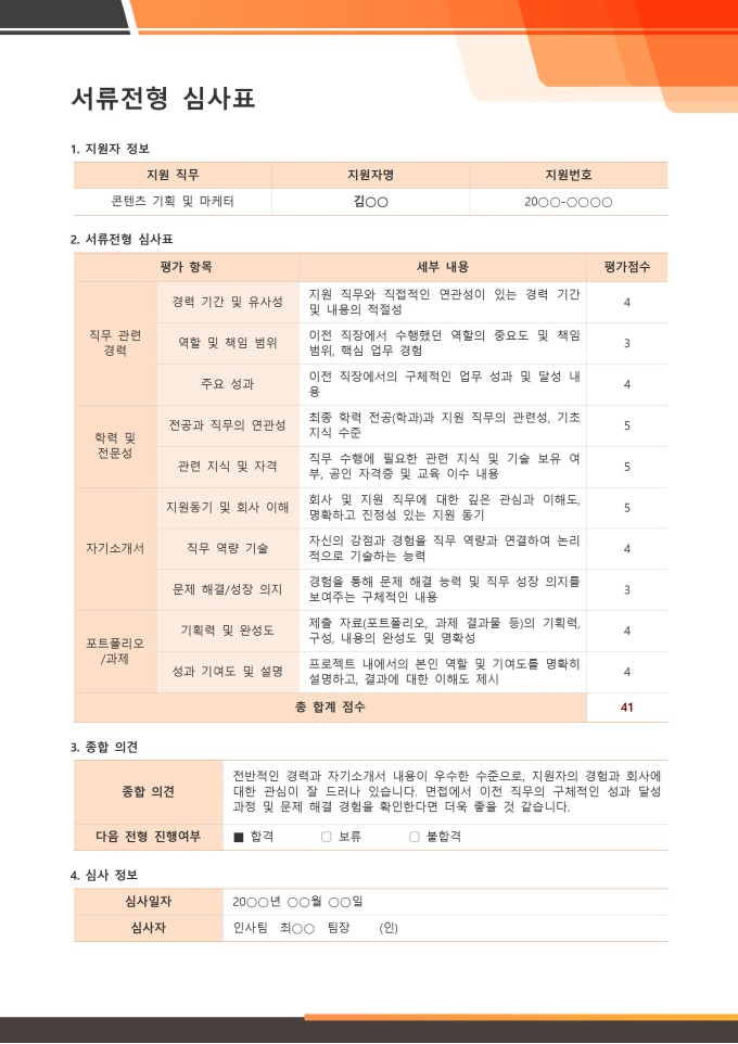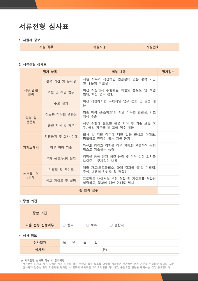 서류전형 심사표 서식입니다. 서류전형 심사표는 기업이나 조직이 입사 지원자들의 제출 서류(이력서, 자기소개서, 경력기술서 등)를 객관적이고 공정하게 평가하기 위해 사용하는 기준표입니다. ★[채용 서식 패키지]는 인재 채용의 전 과정을 체계적으로 관리할 수 있도록 채용공고, 입사지원서, 면접평가표, 신원보증서, 입사서류 체크리스트 등 채용 업무에 필요한 핵심 서식들을 한데 모아 제공합니다. 이 패키지를 활용하면 채용 담당자는 공정하고 효율적인 전형 프로세스를 운영할 수 있습니다.