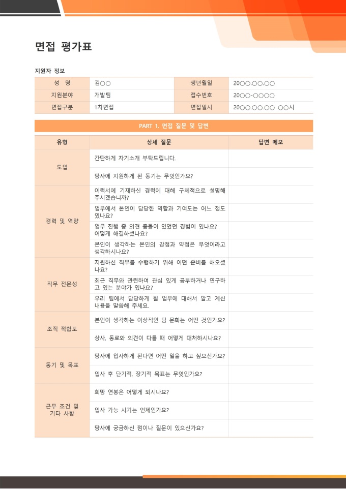 면접 평가표 서식입니다. 면접 평가표는 기업이 채용 면접을 진행할 때, 지원자의 역량, 자질, 태도, 직무 적합성 등을 객관적이고 체계적인 기준으로 평가하기 위해 사용하는 서류입니다. ★[채용 서식 패키지]는 인재 채용의 전 과정을 체계적으로 관리할 수 있도록 채용공고, 입사지원서, 면접평가표, 신원보증서, 입사서류 체크리스트 등 채용 업무에 필요한 핵심 서식들을 한데 모아 제공합니다. 이 패키지를 활용하면 채용 담당자는 공정하고 효율적인 전형 프로세스를 운영할 수 있습니다.