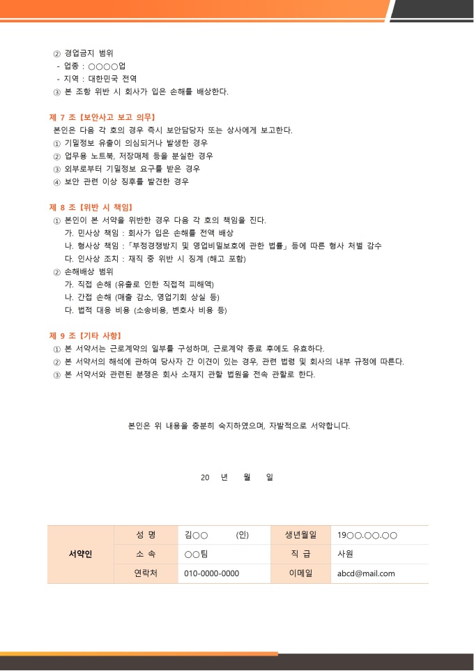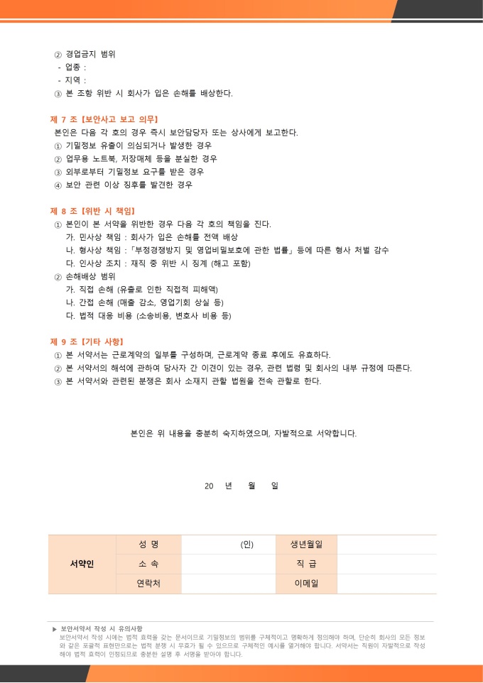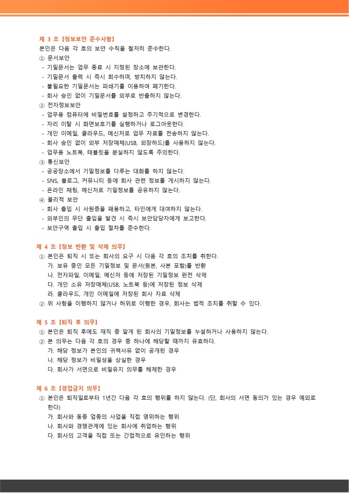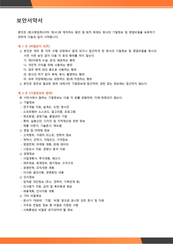 보안서약서 서식입니다. 보안서약서는 회사나 조직의 구성원(직원, 계약직, 협력업체 직원 등)이 업무를 수행하는 과정에서 알게 된 회사 내·외부의 기밀 정보나 개인 정보 등을 외부에 유출하거나 무단으로 사용하지 않을 것을 서약하는 공식 문서입니다. ★[채용 서식 패키지]는 인재 채용의 전 과정을 체계적으로 관리할 수 있도록 채용공고, 입사지원서, 면접평가표, 신원보증서, 입사서류 체크리스트 등 채용 업무에 필요한 핵심 서식들을 한데 모아 제공합니다. 이 패키지를 활용하면 채용 담당자는 공정하고 효율적인 전형 프로세스를 운영할 수 있습니다.