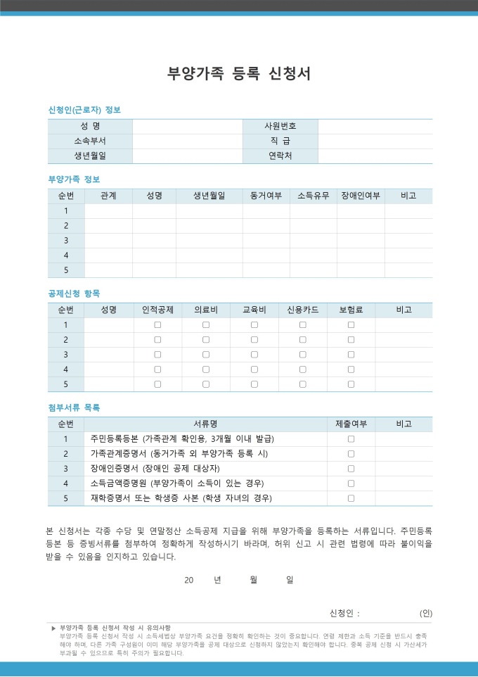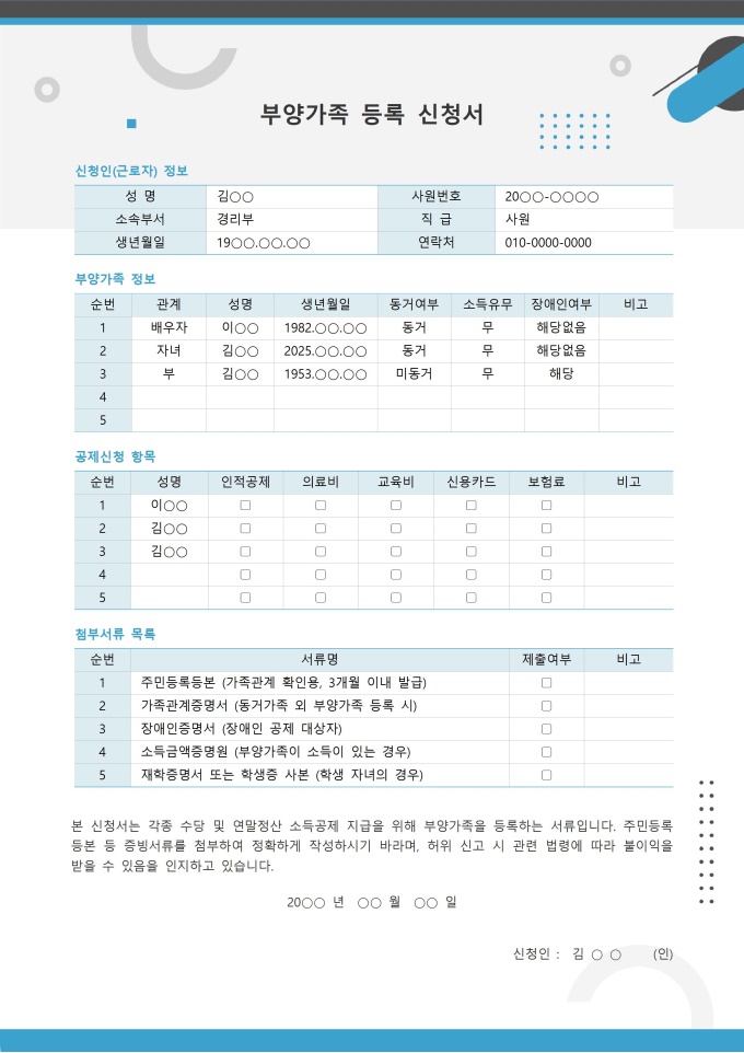 부양가족 등록 신청서 서식입니다. 부양가족 수당 지급 및 소득세 공제 대상이 되는 부양가족 정보를 등록하는 서식입니다. 부양가족 변동 사항 발생 시 즉시 업데이트하여 세무 처리의 정확성을 확보해야 합니다. [입사 패키지]는 입사부터 정규직 전환까지 필요한 모든 절차를 체계적으로 관리할 수 있도록 구성된 올인원 패키지입니다. 기본 인사 정보 등록과 회사 이해를 위한 안내 자료, 멘토링 및 교육 프로그램 운영, 실무 환경 구축을 위한 각종 신청서, 그리고 수습 기간 평가 및 전환 관련 서식까지 단계별로 필요한 서류들을 포함하고 있습니다.