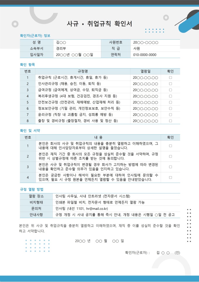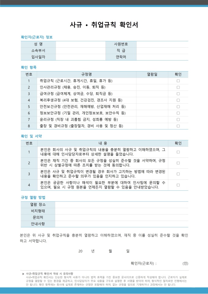 사규·취업규칙 확인서 서식입니다. 회사의 취업규칙 및 각종 사규를 숙지했음을 확인하는 서식으로 회사의 주요 규정을 이해하고 준수하겠다는 서약의 의미를 담고 있습니다. 노사 간 분쟁 예방과 건전한 조직문화 형성에 기여합니다. [입사 패키지]는 입사부터 정규직 전환까지 필요한 모든 절차를 체계적으로 관리할 수 있도록 구성된 올인원 패키지입니다. 기본 인사 정보 등록과 회사 이해를 위한 안내 자료, 멘토링 및 교육 프로그램 운영, 실무 환경 구축을 위한 각종 신청서, 그리고 수습 기간 평가 및 전환 관련 서식까지 단계별로 필요한 서류들을 포함하고 있습니다.