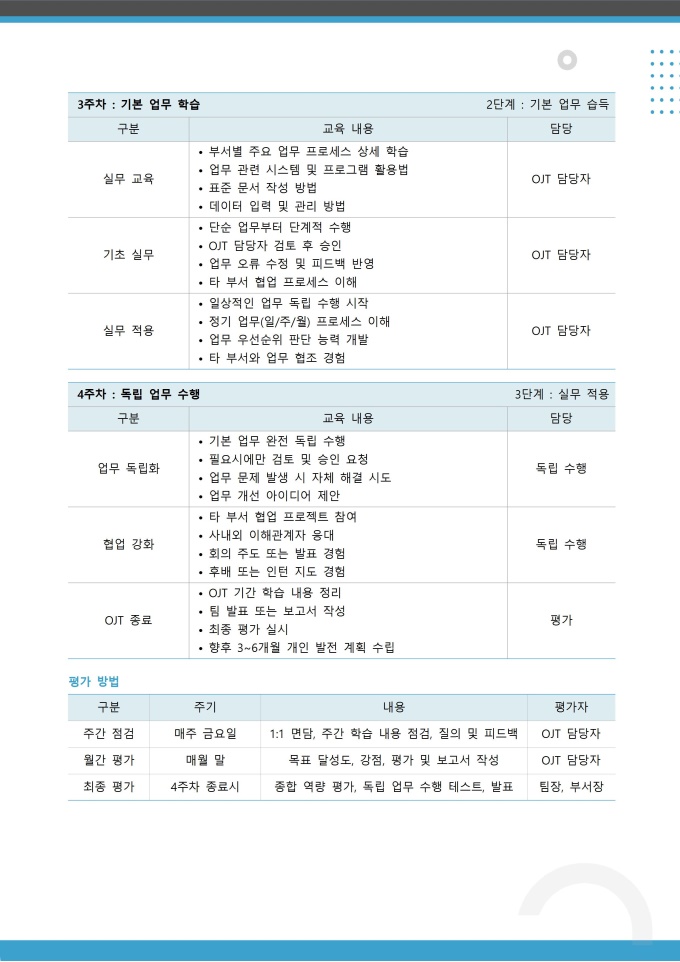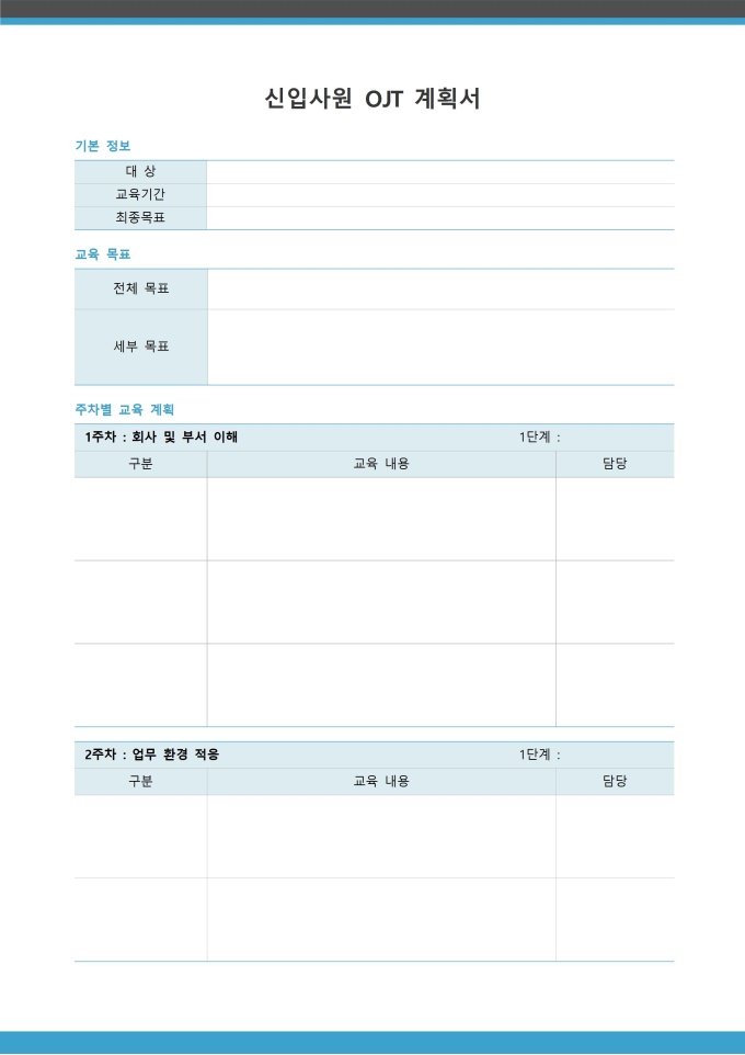 신입사원 OJT 계획서 서식입니다. 현장 실무교육(On-the-Job Training) 계획을 수립하는 서식으로 신입사원의 역량 개발과 조기 전력화를 위한 로드맵 역할을 합니다. [입사 패키지]는 입사부터 정규직 전환까지 필요한 모든 절차를 체계적으로 관리할 수 있도록 구성된 올인원 패키지입니다. 기본 인사 정보 등록과 회사 이해를 위한 안내 자료, 멘토링 및 교육 프로그램 운영, 실무 환경 구축을 위한 각종 신청서, 그리고 수습 기간 평가 및 전환 관련 서식까지 단계별로 필요한 서류들을 포함하고 있습니다.