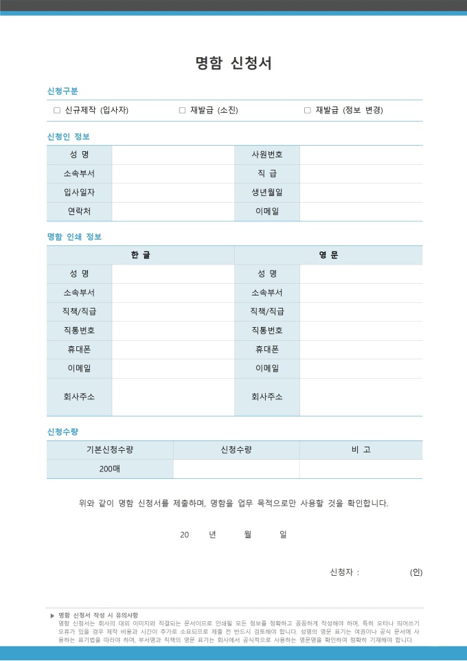 명함 신청서 서식입니다. 업무용 명함 제작을 신청하는 서식으로 성명, 부서, 직책, 연락처 등 명함에 기재될 정보를 정확히 입력하여 오류가 없는 명함을 제작하도록 돕습니다. [입사 패키지]는 입사부터 정규직 전환까지 필요한 모든 절차를 체계적으로 관리할 수 있도록 구성된 올인원 패키지입니다. 기본 인사 정보 등록과 회사 이해를 위한 안내 자료, 멘토링 및 교육 프로그램 운영, 실무 환경 구축을 위한 각종 신청서, 그리고 수습 기간 평가 및 전환 관련 서식까지 단계별로 필요한 서류들을 포함하고 있습니다.