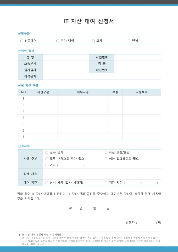 IT 자산 대여 신청서 서식입니다. 업무 수행에 필요한 노트북, 모니터, 휴대전화 등 IT 장비의 대여를 신청하는 서식으로 필요한 장비의 종류와 사양을 기재하여 적절한 IT 자산을 배정받으며, 자산 관리 대장에 등록되어 체계적인 관리가 이루어집니다. [입사 패키지]는 입사부터 정규직 전환까지 필요한 모든 절차를 체계적으로 관리할 수 있도록 구성된 올인원 패키지입니다. 기본 인사 정보 등록과 회사 이해를 위한 안내 자료, 멘토링 및 교육 프로그램 운영, 실무 환경 구축을 위한 각종 신청서, 그리고 수습 기간 평가 및 전환 관련 서식까지 단계별로 필요한 서류들을 포함하고 있습니다.