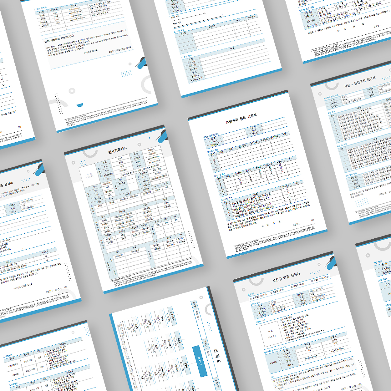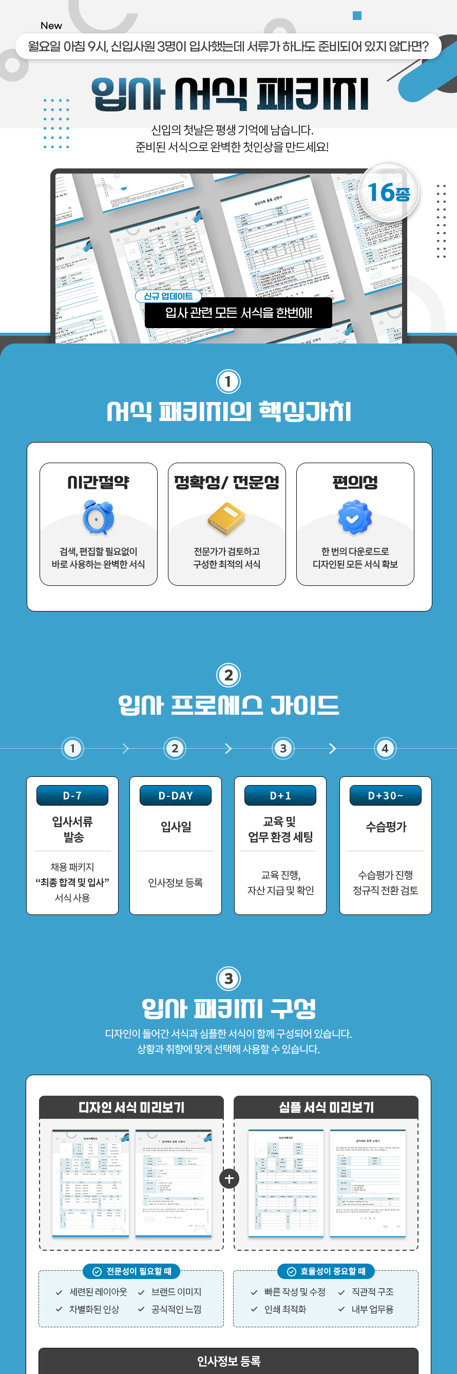[입사 패키지]는 입사부터 정규직 전환까지 필요한 모든 절차를 체계적으로 관리할 수 있도록 구성된 올인원 패키지입니다. 기본 인사 정보 등록과 회사 이해를 위한 안내 자료, 멘토링 및 교육 프로그램 운영, 실무 환경 구축을 위한 각종 신청서, 그리고 수습 기간 평가 및 전환 관련 서식까지 단계별로 필요한 서류들을 포함하고 있습니다.