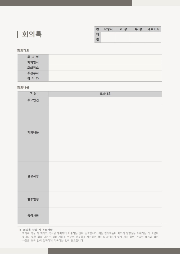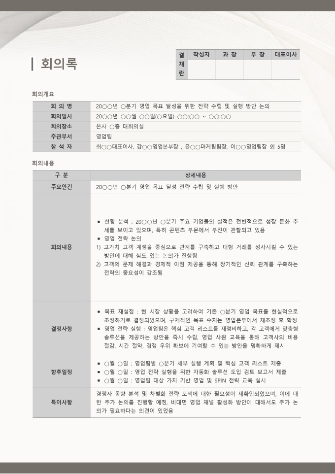 회의록 (2026년 올해의컬러 클라우드댄서) 서식입니다. 회의록은 회의 일시와 장소, 참석자 및 안건, 논의 내용, 결정 사항, 향후 일정과 담당자 등을 명확하고 체계적으로 기록하는 문서입니다. 디자인에 적용된 클라우드댄서 색상의 부드러운 느낌은 문서 전체에 통일감을 부여하여 회의 내용을 한눈에 보기 쉽게 만들며, 실무진과 경영진 모두가 신뢰감 있게 참고할 수 있습니다.