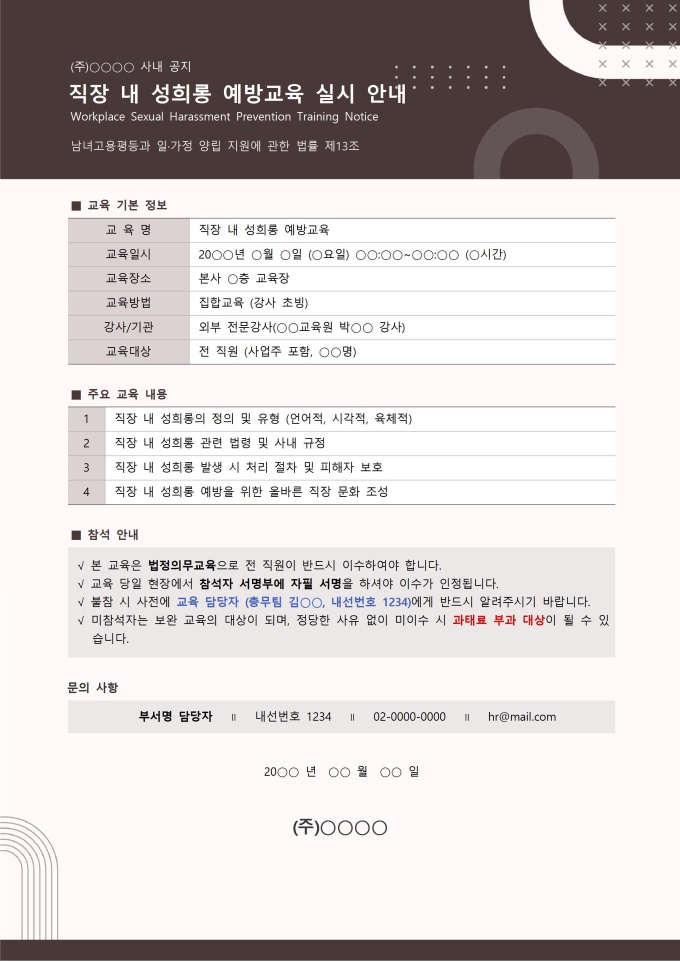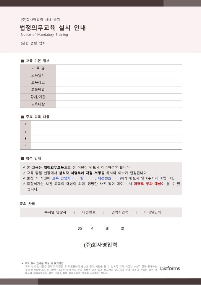 교육 실시 안내문 서식입니다. 교육 실시 안내문은 법정의무교육 프로그램이나 연수의 일정을 참가 대상자에게 공식적으로 알리는 문서로, 교육 일시, 장소, 대상자, 문의사항 등을 명확하게 전달하여 교육 참여를 원활하게 돕습니다. [교육 서식 패키지]는 법정의무교육을 비롯한 기업 내 다양한 교육 과정을 체계적으로 운영하고 관리할 수 있도록 구성된 맞춤형 솔루션입니다. 교육 대상자 명단, 교육 결과 보고서, 교육 참석자 서명부 등 필수 서식을 포함하여 교육 일정 계획부터 이수 관리까지 모든 단계를 효율적으로 지원합니다. 이를 통해 사업장은 교육 이수 의무를 정확히 준수하며, 직원들의 역량 강화와 안전한 근무 환경 조성에 기여할 수 있습니다.
