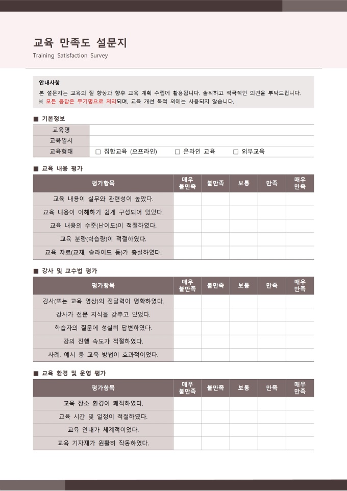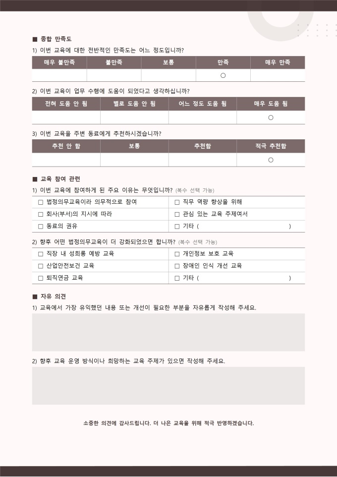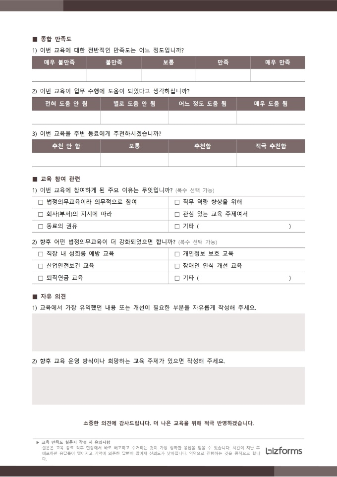 교육 만족도 설문지 서식입니다. 교육 만족도 설문지는 실시한 교육 프로그램에 대해 참여자들이 느낀 전반적인 만족도를 평가하고 의견을 수집하는 중요한 문서입니다. 이 설문지는 교육 내용, 강의 진행, 강사의 전문성, 교육 환경, 교육 효과 등 다양한 항목을 체계적으로 조사하여 교육의 질을 객관적으로 판단할 수 있도록 돕습니다. [교육 서식 패키지]는 법정의무교육을 비롯한 기업 내 다양한 교육 과정을 체계적으로 운영하고 관리할 수 있도록 구성된 맞춤형 솔루션입니다. 교육 대상자 명단, 교육 결과 보고서, 교육 참석자 서명부 등 필수 서식을 포함하여 교육 일정 계획부터 이수 관리까지 모든 단계를 효율적으로 지원합니다. 이를 통해 사업장은 교육 이수 의무를 정확히 준수하며, 직원들의 역량 강화와 안전한 근무 환경 조성에 기여할 수 있습니다.