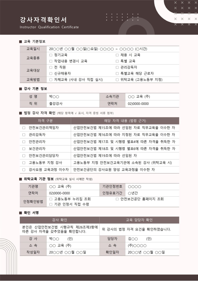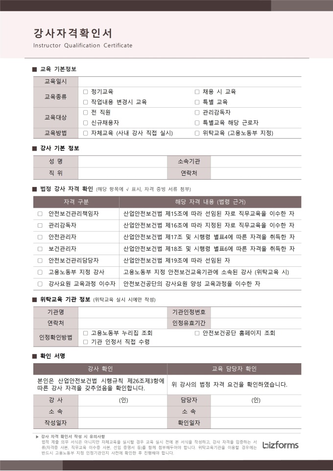 강사 자격 확인서 서식입니다. 강사 자격 확인서는 교육이나 강의에 참여하는 강사가 해당 분야에 적합한 자격을 갖추었음을 공식적으로 증명하는 문서입니다. 이 확인서에는 교육 기본정보, 강사 정보, 법정 강사 자격 확인 등의 내용을 포함하여 교육기관이나 수강생이 강사의 전문성과 신뢰성을 판단하는 데 중요한 근거 자료로 활용됩니다. [교육 서식 패키지]는 법정의무교육을 비롯한 기업 내 다양한 교육 과정을 체계적으로 운영하고 관리할 수 있도록 구성된 맞춤형 솔루션입니다. 교육 대상자 명단, 교육 결과 보고서, 교육 참석자 서명부 등 필수 서식을 포함하여 교육 일정 계획부터 이수 관리까지 모든 단계를 효율적으로 지원합니다. 이를 통해 사업장은 교육 이수 의무를 정확히 준수하며, 직원들의 역량 강화와 안전한 근무 환경 조성에 기여할 수 있습니다.