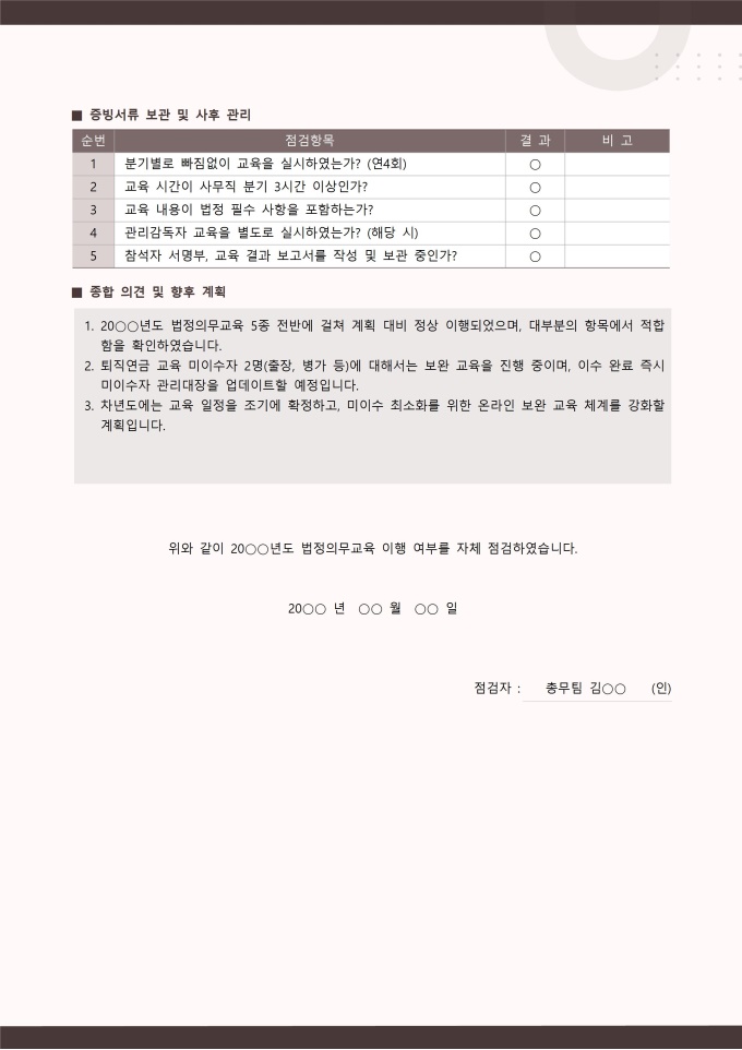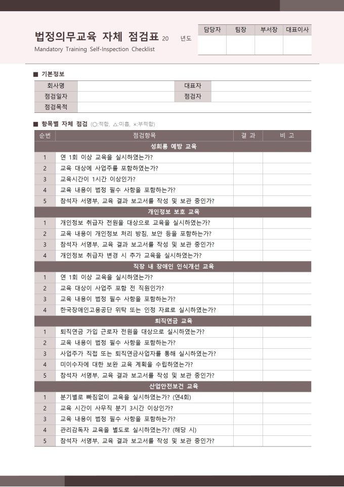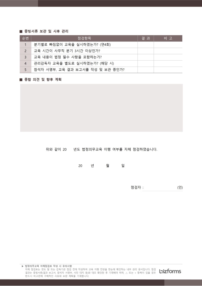 법정의무교육 자체 점검표 서식입니다. 법정의무교육 자체 점검표는 사업장 내에서 법정 의무교육이 계획대로 제대로 이행되고 있는지 자체적으로 점검하고 확인하기 위한 문서입니다. 이 점검표에는 교육 대상자의 이수 여부, 교육 실시 날짜와 시간, 교육 내용의 적합성, 교육 방법 및 장소, 교육 자료 활용 현황 등 주요 점검 항목이 체계적으로 포함되어 있어 교육 운영의 적합성 여부를 객관적으로 평가할 수 있습니다. [교육 서식 패키지]는 법정의무교육을 비롯한 기업 내 다양한 교육 과정을 체계적으로 운영하고 관리할 수 있도록 구성된 맞춤형 솔루션입니다. 교육 대상자 명단, 교육 결과 보고서, 교육 참석자 서명부 등 필수 서식을 포함하여 교육 일정 계획부터 이수 관리까지 모든 단계를 효율적으로 지원합니다. 이를 통해 사업장은 교육 이수 의무를 정확히 준수하며, 직원들의 역량 강화와 안전한 근무 환경 조성에 기여할 수 있습니다.