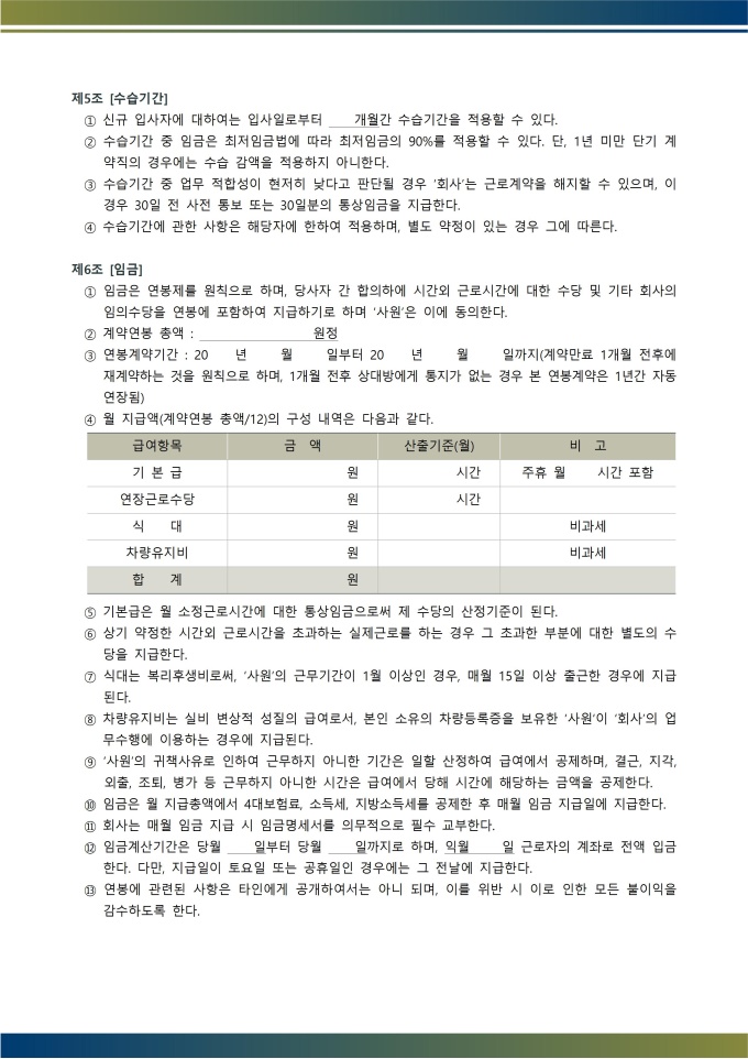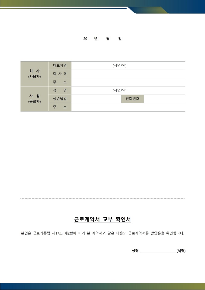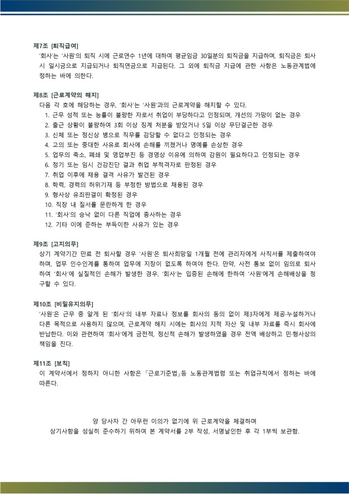 1. 교부 의무 : 서명 완료 후 즉시 근로자에게 계약서 사본을 교부. 교부하지 않으면 법적 처벌 대상