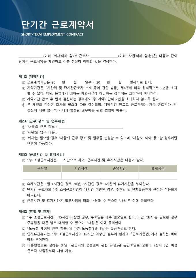 단기간 근로계약서는 수일에서 수개월 이내의 단기 기간을 정하여 근로계약을 체결할 때 사용하는 문서입니다. 계절적 수요 증가, 행사·프로젝트 단위 인력 충원, 결원 대체, 성수기 단기 고용 등 한시적으로 인력이 필요한 상황에서 활용됩니다.