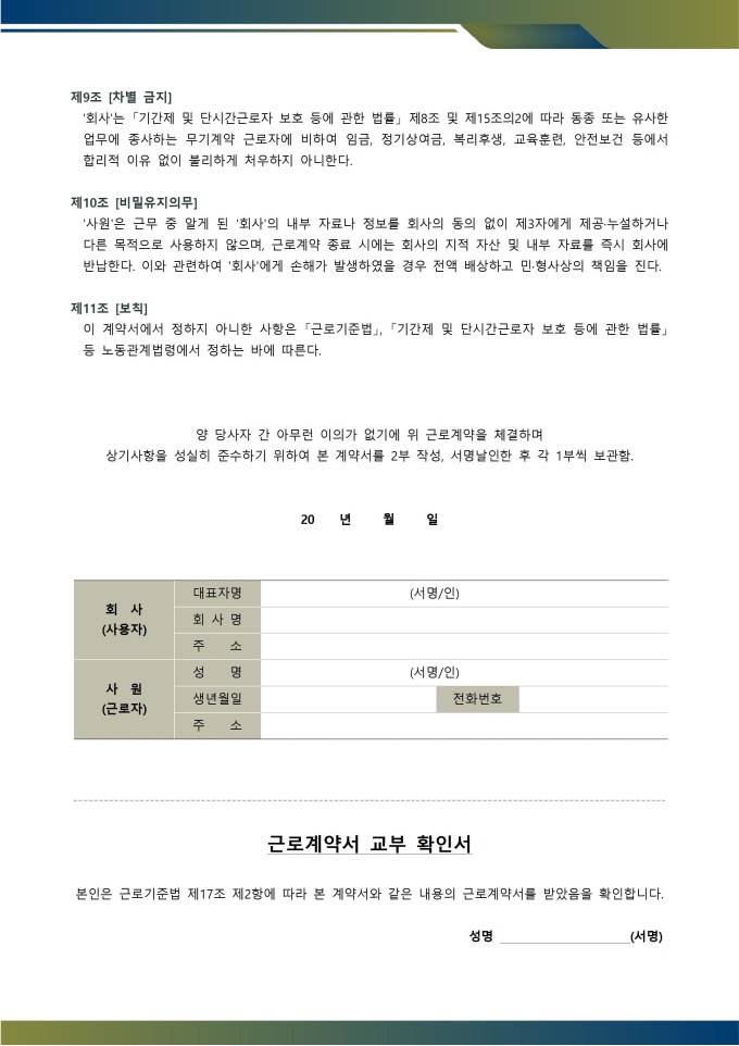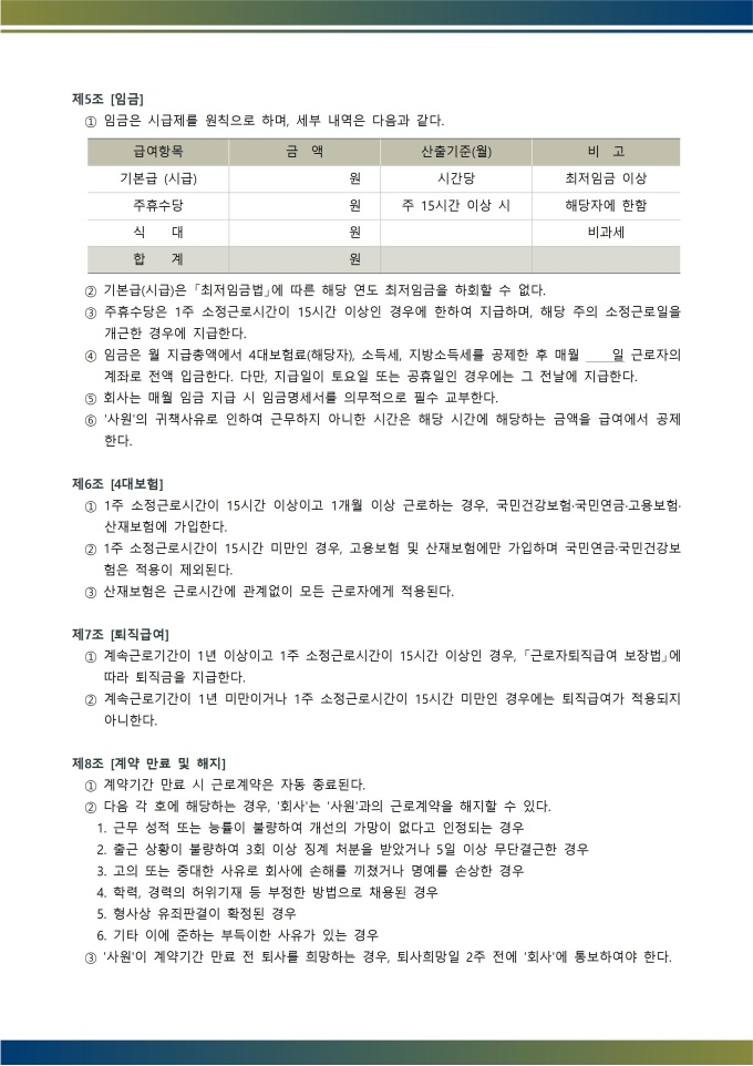 4. 묵시적 갱신 주의 : 계약 만료 후 근로자가 계속 출근하고 사용자가 별다른 조치를 취하지 않으면 묵시적 갱신으로 간주될 수 있으므로 계약 만료 전 명확한 종료 의사 전달이 필요