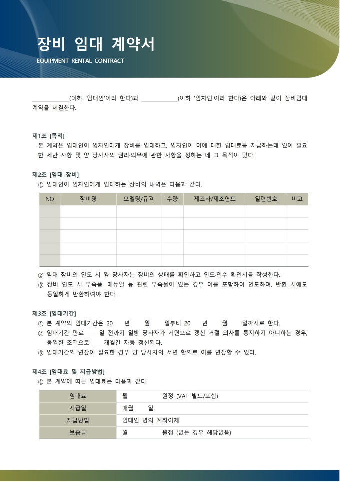 장비 임대 계약서는 임대인이 보유한 특정 장비·기계·설비·기기 등을 임차인에게 일정 기간 사용하게 하고 임차인은 그에 대한 임대료를 지급하기로 합의한 내용을 공식 문서로 기록하는 계약서입니다. 건설 중장비, 의료 기기, 영상·음향 장비, 사무 기기, 산업 설비, IT 장비 등 고가 장비를 직접 구매하는 대신 필요한 기간만큼 임대하여 초기 투자 비용을 절감하고 자산 관리 부담을 줄이는 목적으로 폭넓게 활용됩니다.