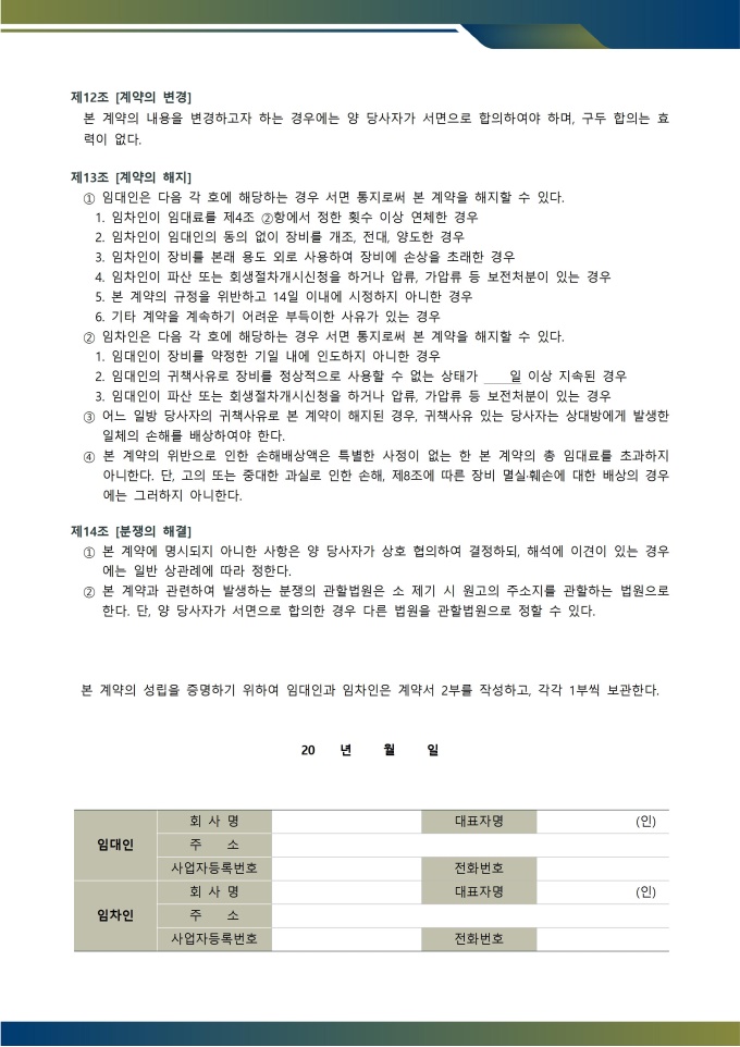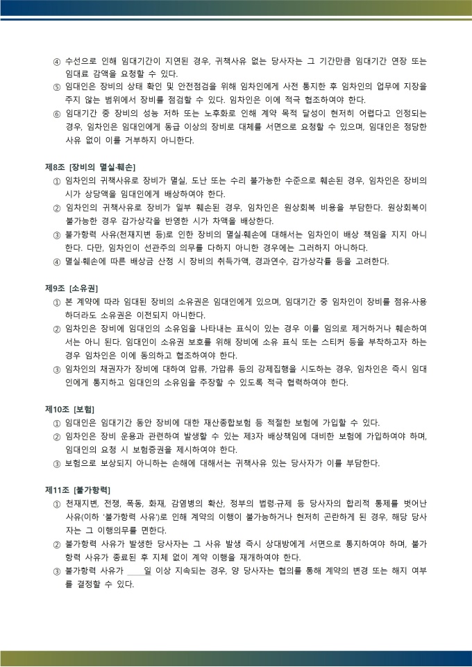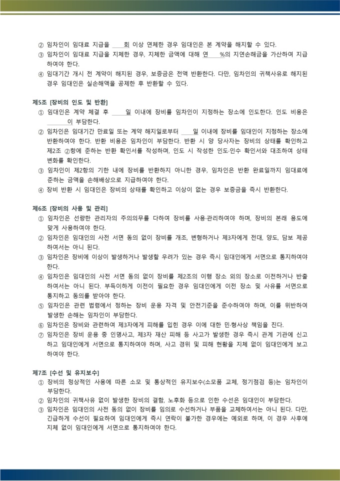 3. 용도 외 사용 금지 : 계약서에 명시된 사용 목적 외의 용도로 장비를 사용하는 것을 금지. 용도 외 사용으로 인한 고장·손상은 임차인이 전액 부담