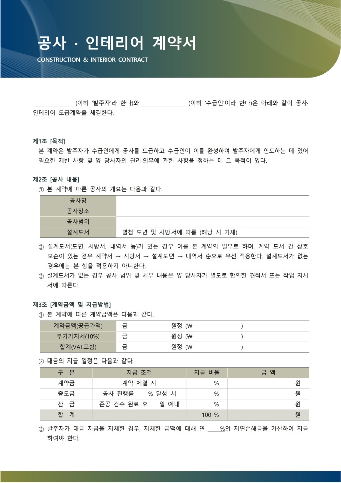 공사·인테리어 계약서는 건물 신축, 리모델링, 인테리어 시공, 설비 공사 등 건설 및 인테리어 관련 공사를 발주하는 건축주(도급인)와 이를 수주하는 시공사(수급인) 간에 공사의 범위, 공사 금액, 공사 기간, 품질 기준, 대금 지급 조건 등 공사 전반에 관한 사항을 공식 문서로 기록하는 계약서입니다.