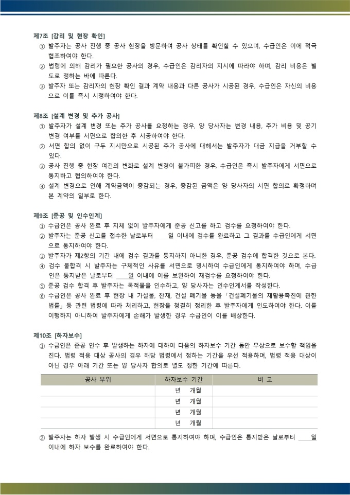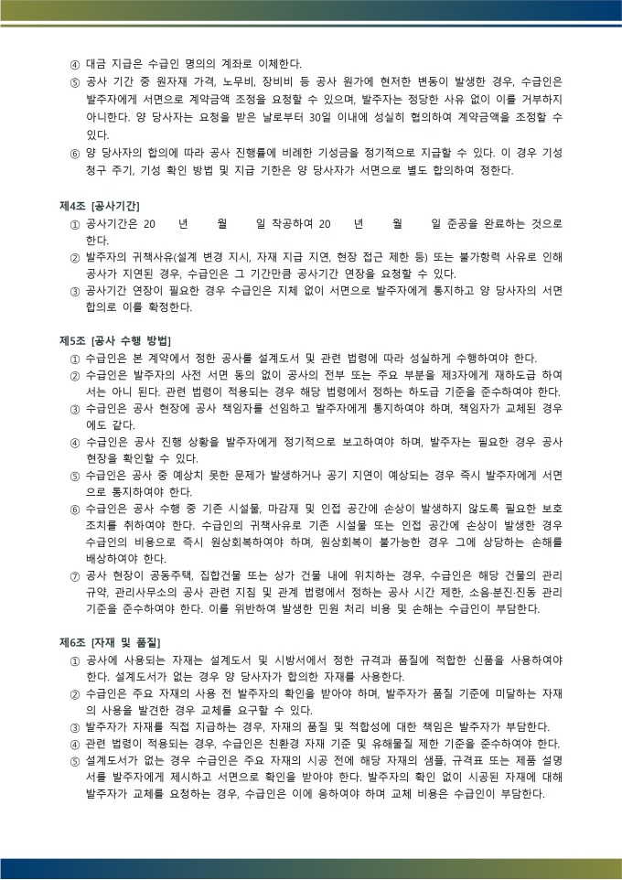 - 추가 공사비 분쟁 : 공사 중 설계 변경, 자재 업그레이드, 예상치 못한 철거 공사 발생 시 추가 비용 청구를 둘러싼 갈등. 추가 공사 발생 시 반드시 서면 합의를 거치도록 계약서에 규정