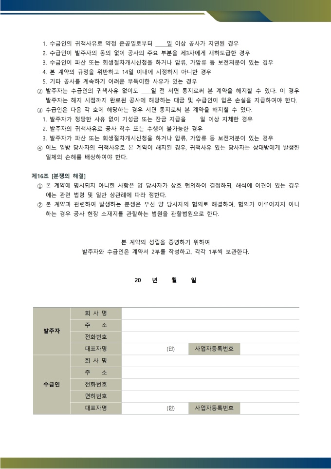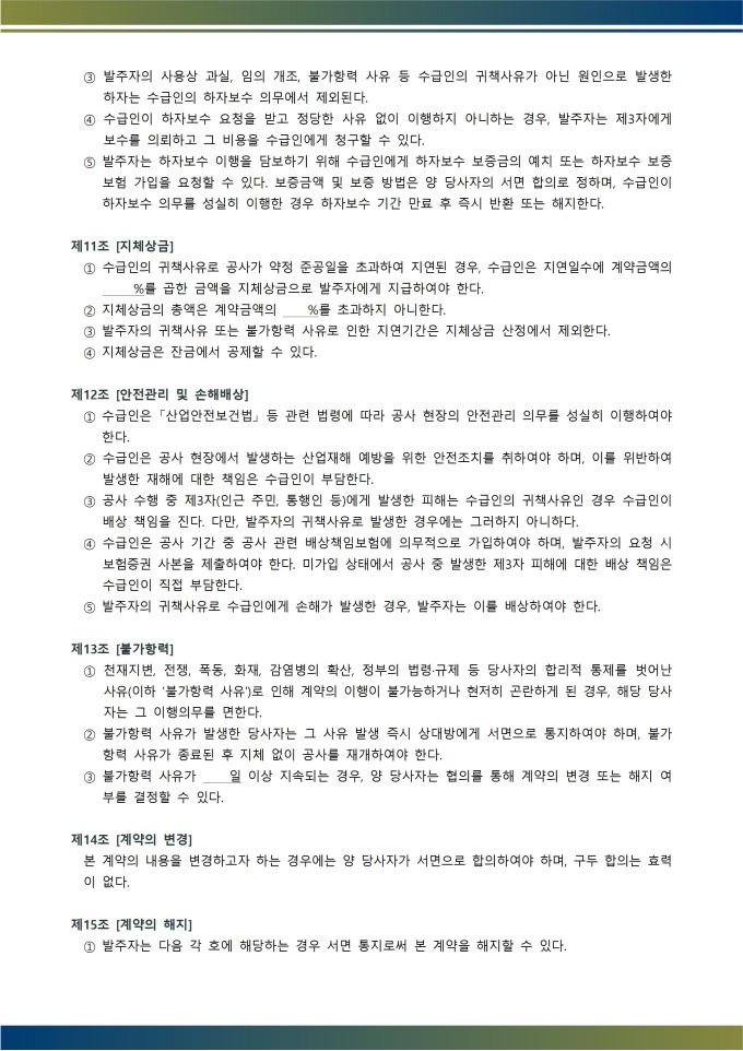 - 대금 미지급 분쟁 : 공사 완료 후 잔금 지급을 거부하거나 지연하는 경우. 공사 완료 기준과 잔금 지급 조건을 연계하여 규정