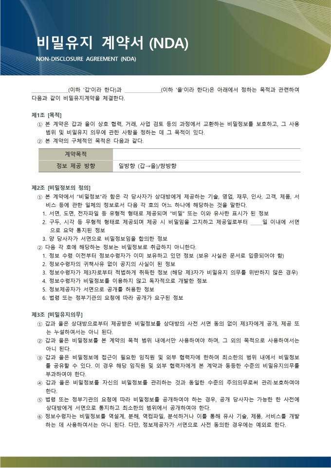 비밀유지 계약서(NDA)는 계약 당사자 간에 공유되는 기술 정보, 영업 비밀, 사업 계획, 고객 데이터 등 비밀 정보를 제3자에게 누설하거나 계약 목적 외의 용도로 사용하지 않겠다는 의무를 공식 문서로 규정하는 계약서입니다.