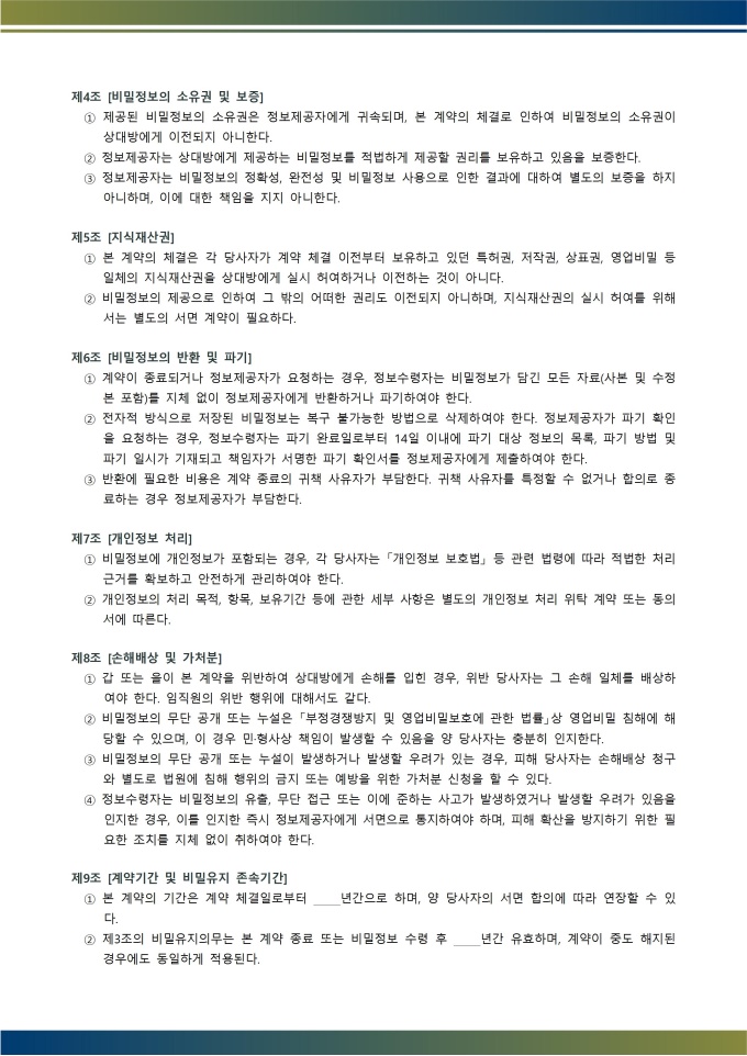 💡 작성 TIP : NDA에서 가장 중요한 조항은 비밀 정보의 정의와 비밀유지 의무 존속 기간입니다. 비밀 정보의 범위가 너무 광범위하면 수령자가 일상적인 업무도 제약받는다고 주장하여 NDA 자체의 효력이 도전받을 수 있으며, 너무 좁으면 핵심 정보가 보호받지 못하는 공백이 생깁니다.