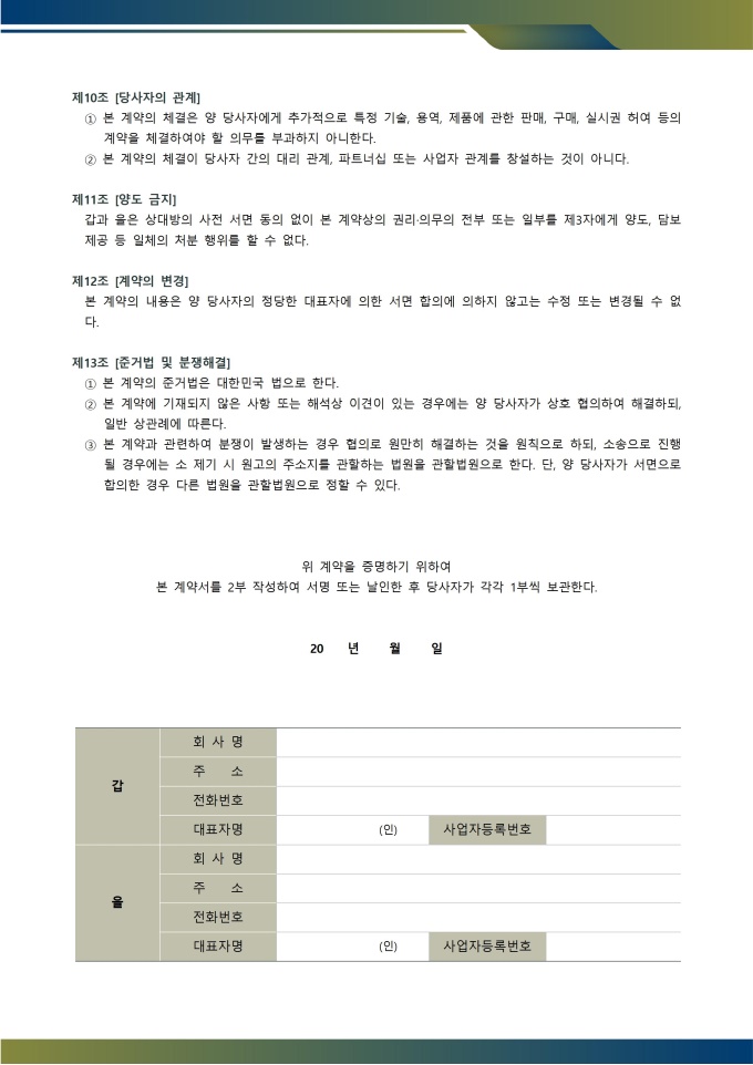 - 다자간 NDA : 3인 이상의 당사자가 참여하는 협업 프로젝트에서 모든 참여자 간 비밀유지 의무를 규정. 하나의 NDA로 다수 당사자 간 의무를 처리할 수 있어 계약 관리가 효율적
