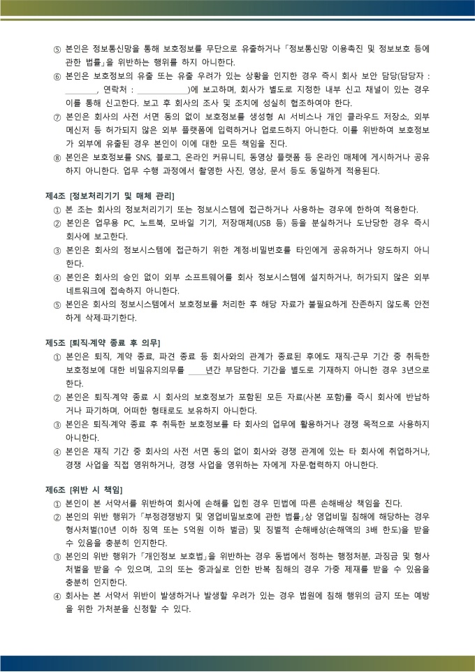 - 비밀 정보 범위 명확화 : "회사의 기밀 정보"처럼 추상적으로 기재하기보다 영업 비밀, 고객 명단, 거래 조건, 원가 정보, 기술 설계도, 소스 코드, 미공개 재무 정보, 인사 정보, 경영 전략 등 보호 대상 정보 유형을 구체적으로 열거