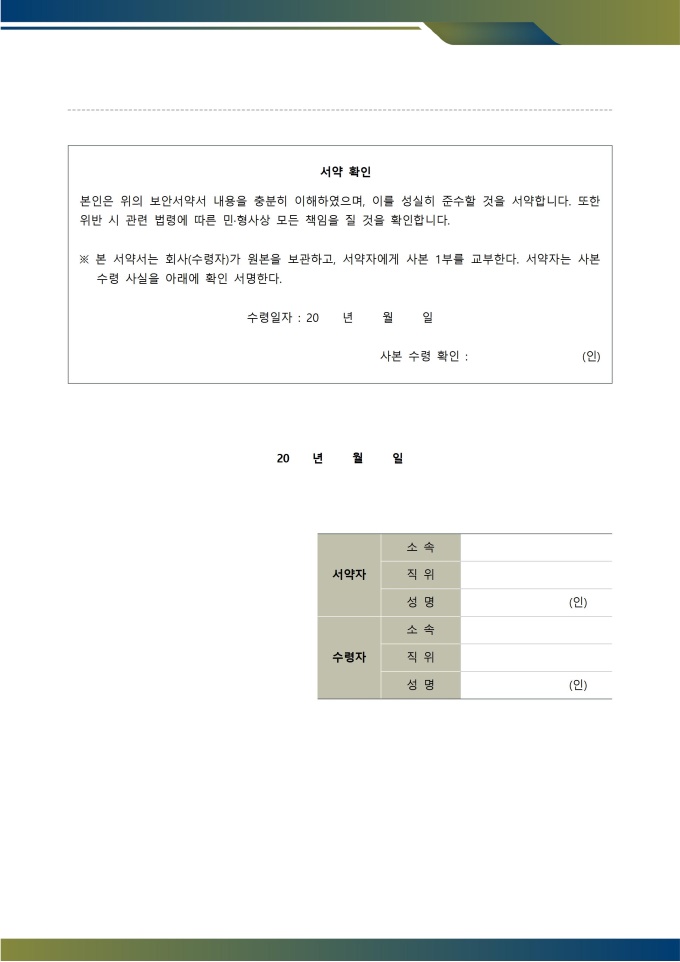 💡 작성 TIP : 보안서약서의 실효성은 서명 행위 자체보다 서약 내용에 대한 서약자의 충분한 이해에서 나옵니다. 서명 전 보안서약서의 주요 내용을 담당자가 직접 설명하고, 서약자가 궁금한 사항을 질의할 수 있는 기회를 제공하는 것이 중요합니다.
