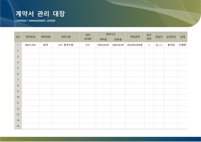 계약서 관리 대장은 기업이 체결한 모든 계약의 현황을 한 곳에 등록하고 계약 기간, 계약 금액, 보관 위치 등 계약의 생애주기 전반을 체계적으로 추적·관리하는 문서입니다.