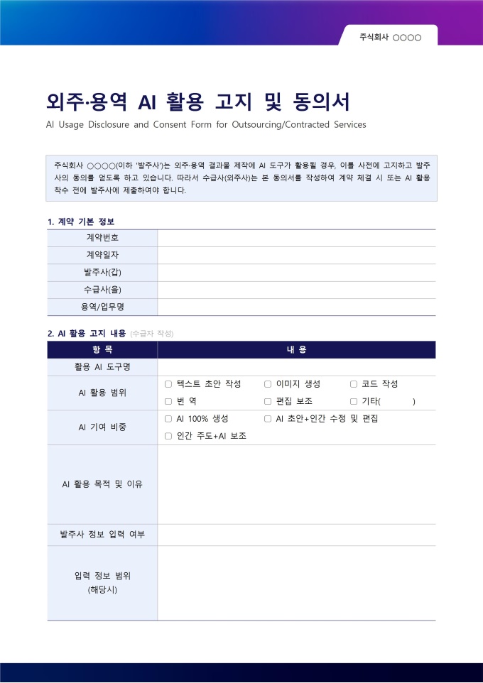 계약 진행 중 당초 고지한 것과 다른 AI 도구를 추가로 사용하거나 활용 범위가 달라지면 본 서식을 재작성하여 발주사에 다시 동의를 받아야 합니다.