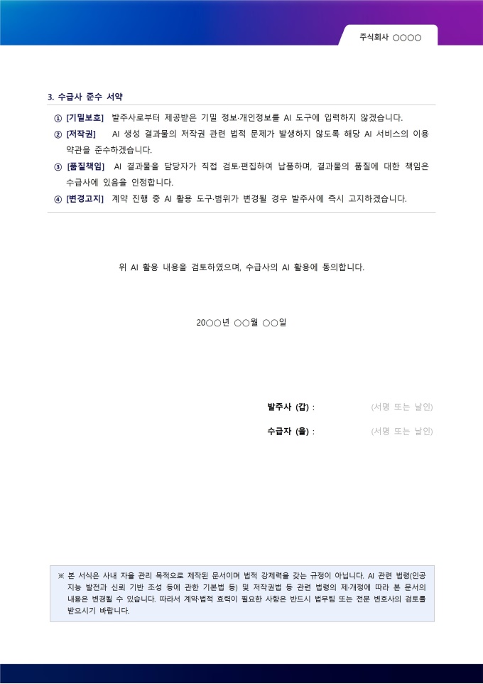 "AI 이미지 생성 불가" 또는 "발주사 제공 자료의 AI 입력 금지"처럼 조건을 명확히 기재해두어야 이후 분쟁 시 기준이 됩니다.