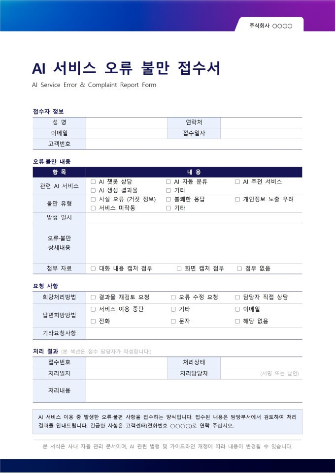 AI 서비스 오류 불만 접수 양식은 AI 챗봇, AI 자동 분류, AI 추천 서비스 등 AI 기반 서비스 이용 중 발생한 오류나 불편 사항을 고객으로부터 공식적으로 접수하기 위한 서식입니다. 일반적인 고객 불만 접수 양식과 달리 AI 특유의 오류 유형(사실 오류, 불쾌한 응답, 개인정보 노출 우려 등)을 분류하여 체크할 수 있도록 설계되어 있습니다.