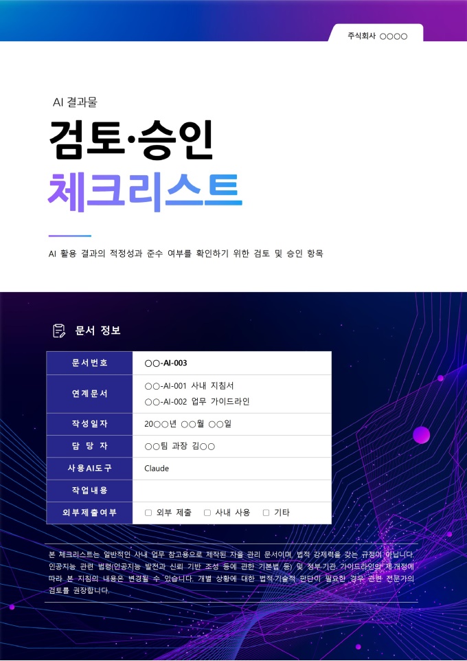 AI 결과물 검토·승인 체크리스트는 AI 도구가 생성한 결과물을 업무에 활용하거나 외부에 제출하기 전, 담당자가 반드시 확인해야 할 항목을 단계별로 점검하기 위한 서식입니다. AI 결과물을 검토 없이 그대로 사용하는 것은 사실 오류, 저작권 침해, 개인정보 노출 등 다양한 문제로 이어질 수 있습니다. 이 체크리스트는 그 과정을 문서로 남겨 책임 소재를 명확히 하는 역할도 합니다.
