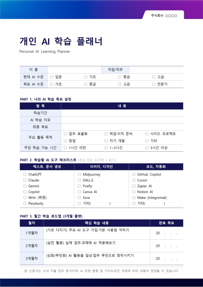 AI를 배우고 싶은 마음은 있지만 어디서부터 시작해야 할지 모르는 사람, 유튜브나 강의를 보다가 흐지부지 끝나는 패턴이 반복되는 사람, AI를 배워서 취업, 이직, 업무 효율화에 활용하고 싶은 사람에게 필요한 도구입니다. 플래너는 목표와 계획을 문서로 남김으로써 학습 지속 가능성을 높여줍니다. 매주 기록하는 과정 자체가 학습 루틴을 만드는 역할을 하고, 3개월 후 성장 기록을 되돌아보면 이직, 취업 포트폴리오 작성에도 활용할 수 있습니다.