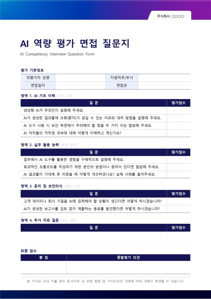 AI 역량 평가 면접 질문지는 채용 면접에서 지원자의 AI 활용 능력을 검증하기 위한 면접관용 가이드 서식입니다. 어떤 질문을 해야 AI 역량을 제대로 파악할 수 있는지 막막한 면접관을 위해 기초, 중급, 심화 3단계로 구분된 9개 핵심 질문과 각 질문의 의도, 채점 기준을 함께 제공합니다.