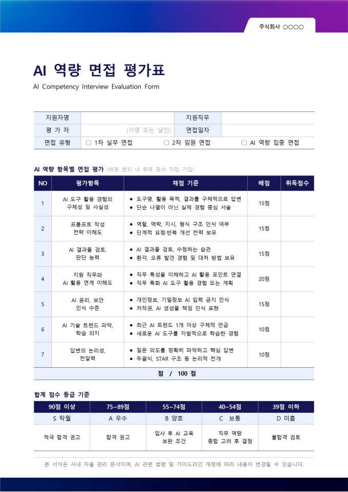 AI 역량 면접 평가표는 채용 면접에서 지원자의 AI 활용 역량을 항목별로 채점하고 합격 여부를 결정하기 위한 면접관용 평가 서식입니다. 면접관의 주관적 인상이 아닌 명확한 채점 기준을 바탕으로 공정하고 일관된 평가가 가능하도록 설계되어 있으며, 면접 종료 후 평가 근거를 문서로 남길 수 있습니다.