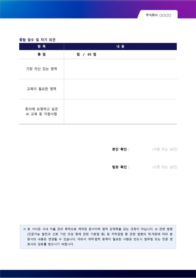 AI 역량 자기 평가서는 임직원이 자신의 AI 활용 역량을 스스로 점검하고 강점과 보완 영역을 파악하기 위한 자가 진단 서식입니다. 평가 결과는 인사 평가에 직접 반영되지 않으며, 부서별 AI 교육 계획 수립과 개인별 맞춤 교육 설계를 위한 참고 자료로 활용됩니다.