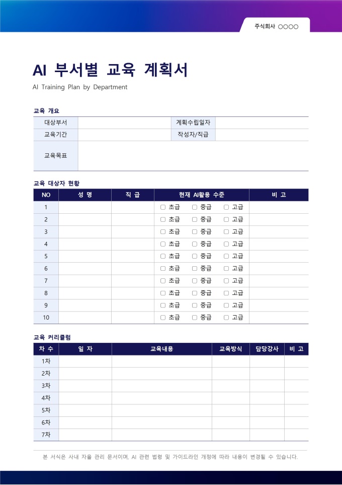AI 부서별 교육 계획서는 부서 단위로 AI 활용 교육을 체계적으로 기획하고 실행하기 위한 서식입니다. 전사 공통 교육이 아닌 부서별 업무 특성과 구성원의 현재 AI 역량 수준에 맞춘 맞춤형 교육 계획을 수립할 수 있도록 설계되어 있습니다. 교육 목표 설정부터 대상자 현황 파악, 커리큘럼 구성, 예산 계획까지 한 장에서 완결되는 구조를 갖추고 있습니다.