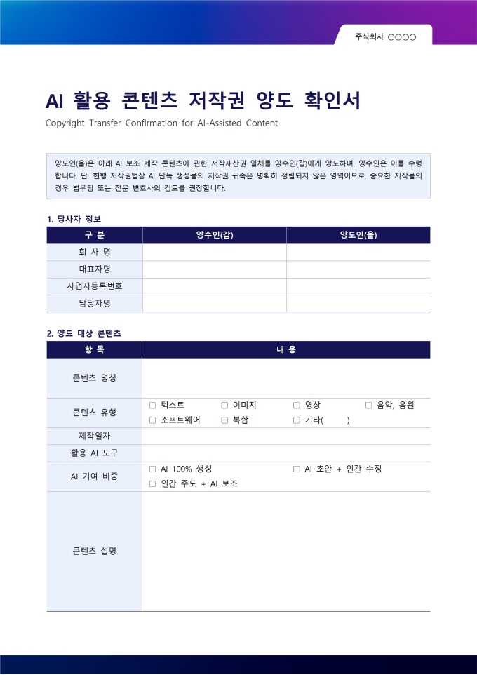 AI 활용 콘텐츠 저작권 양도 확인서는 AI 도구를 활용하여 제작한 콘텐츠에 관한 저작재산권을 양도인에서 양수인으로 이전할 때 양측의 합의를 공식적으로 기록하는 서식입니다. AI 보조 제작 콘텐츠는 일반 창작물과 달리 저작권 귀속 여부 자체가 불명확한 경우가 있어, 양도 시점에 권리 관계를 명확히 문서화해두는 것이 이후 분쟁 예방에 핵심적인 역할을 합니다.