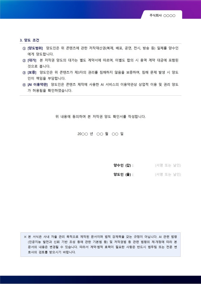 광고 캠페인, 브랜드 영상처럼 상업적 가치가 높은 콘텐츠의 저작권 양도는 서식 작성 전에 법무팀 또는 전문 변호사 검토를 먼저 받는 것을 권장합니다.