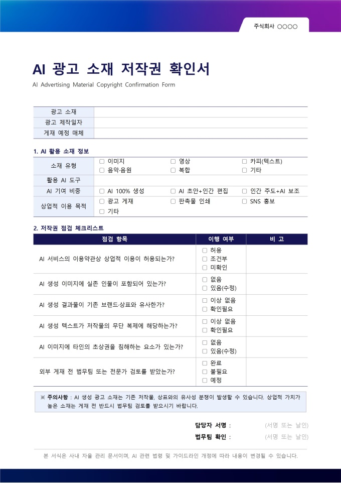 AI 광고 소재 저작권 확인서는 AI 도구를 활용하여 제작한 광고, 마케팅 소재를 외부에 게재하거나 상업적으로 활용하기 전, 저작권, 초상권, 상표권 등 지식재산권 관련 사항을 사전에 점검하기 위한 서식입니다. AI 생성 이미지, 카피, 영상, 음원 등을 광고에 활용하는 경우가 빠르게 늘고 있지만 게재 후 저작권 분쟁이 발생하면 광고 중단, 손해배상, 브랜드 이미지 훼손으로 이어질 수 있습니다. 게재 전 한 번의 점검으로 이런 리스크를 사전에 차단할 수 있습니다.