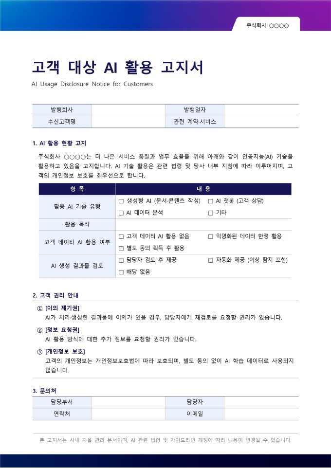 고객 대상 AI 활용 고지서는 기업이 고객에게 제공하는 서비스나 제품에 AI 기술이 활용됨을 투명하게 알리기 위한 서식입니다.