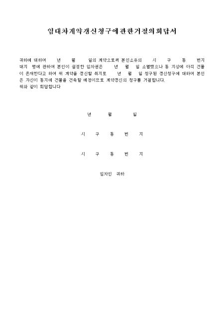 임대차 계약갱신 청구에 대해 거절할 때 사용하는 회답서입니다.