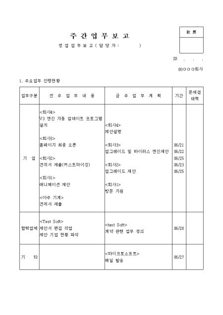 주간업무보고 양식으로 사내와 협력업체로 나눠 기재되어 있습니다.(샘플로 내용기입참고)