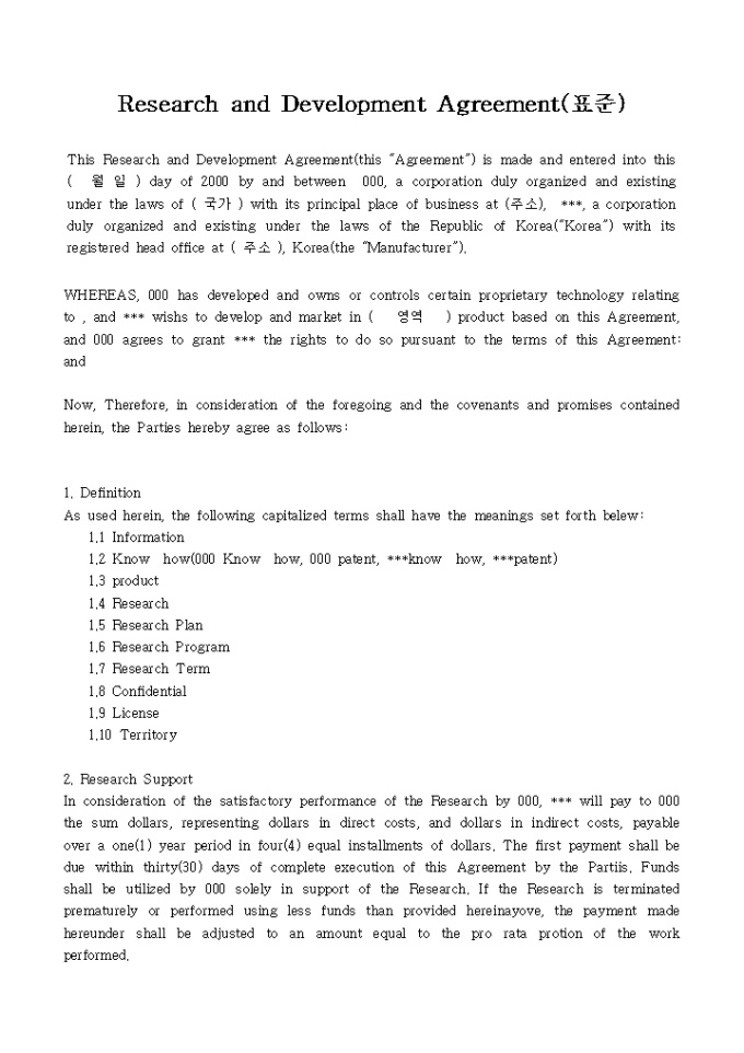 9,000원/월Research and Development Agreement양식입니다.18개조항으로 구성되어 있습니다.