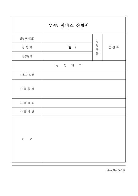 VPN 서비스 신청시 작성하는 양식입니다. 신청부서와 신청자, 신청일자를 포함한 신청내역을 기재합니다.