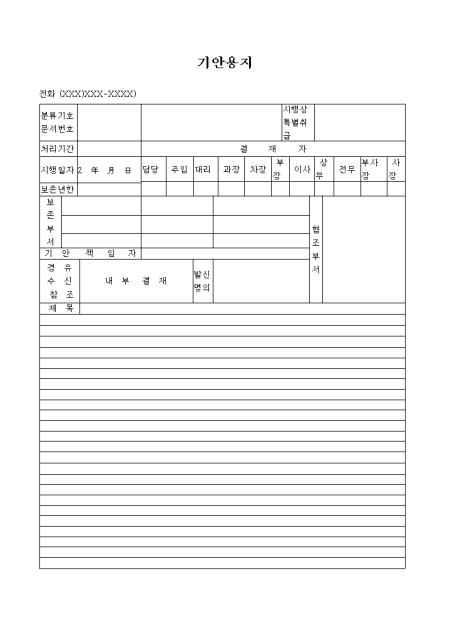 분류기호,처리기간,시행일자,보존년한,보존부서,결재란이 있는 기안용지입니다.