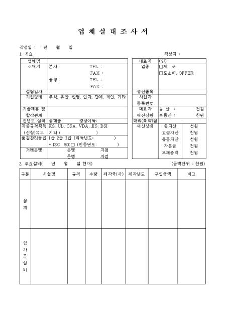 업체 개요,주요설비,추가생산 및 시설계획,종업원 현황을 기록하는 업체실태조사서입니다.