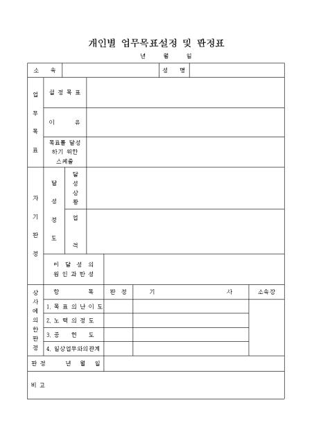 개인별로 업무의 목표를 설정하고 거기에 대한 가기판정과 상사에 의한 판정을 기재하는 양식입니다.