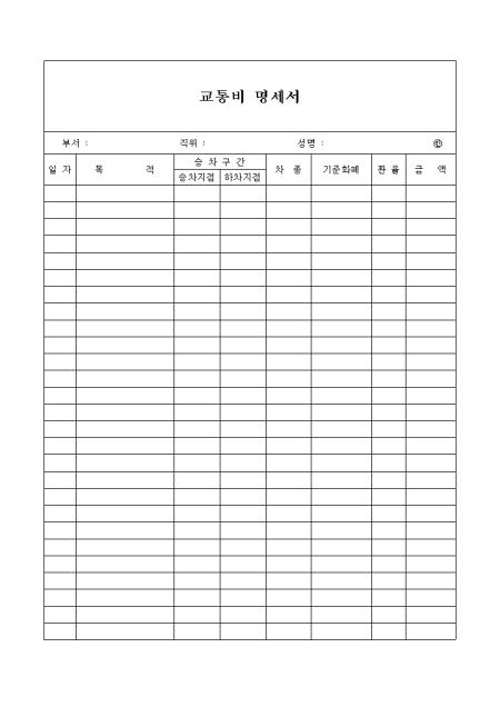 교통비 사용내용을 기재하도록 되어 있는 명세서 양식입니다.