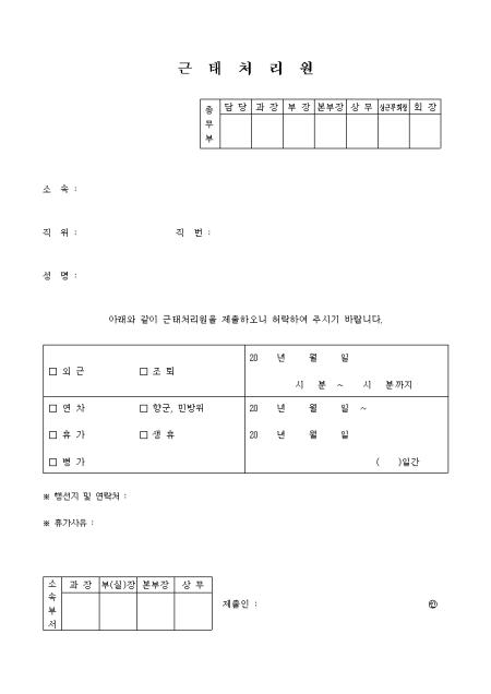 외근, 조퇴, 연차, 휴가, 병가, 향군.민방위, 생리휴가등을 신청할때 사용하는 근태처리원양식입니다.